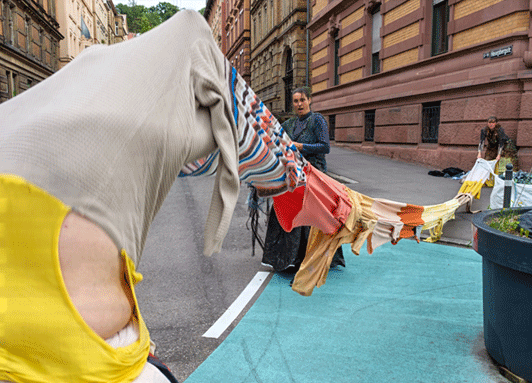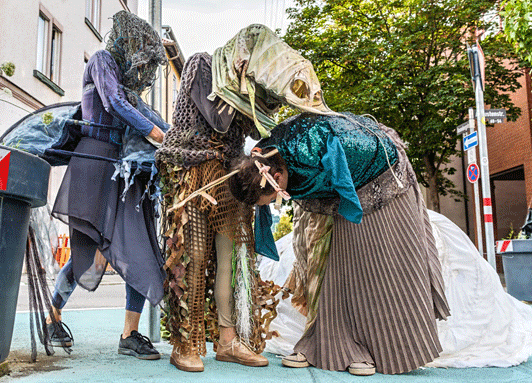 Vier geheimnisvolle Gestalten bewegen sich durch den Stadtraum – mal laut, mal leise, ständig im Fluss. Sie begeben sich auf eine sinnliche Reise durch verschiedene Zustände des Seins und fragen nach Klimagerechtigkeit, Veränderbarkeit und unserer aktiven Rolle in einer Welt im Umbruch.